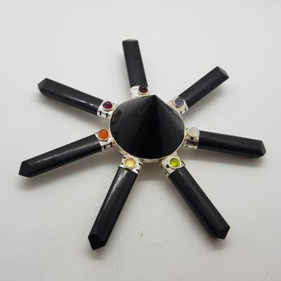 Large Black Tourmaline generator set with chakra stones and a cone shape in the centre. An excellent piece on its own or as part of a grid.