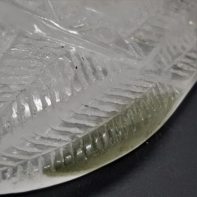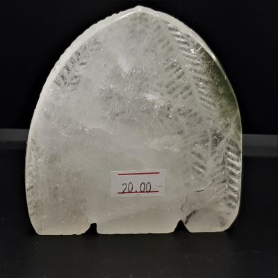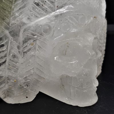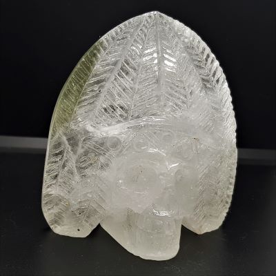 Clear Quartz skull with feathers. This piece is flat backed and flat base so will lie or stand.