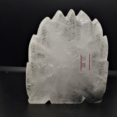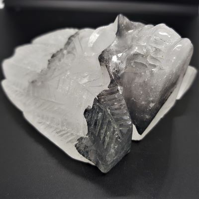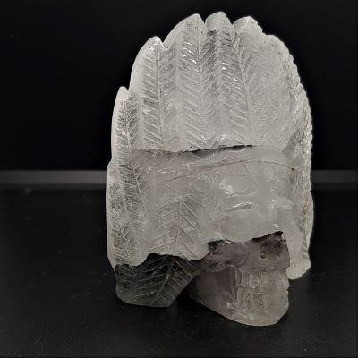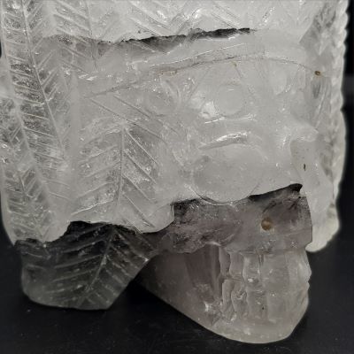 Clear Quartz skull with feathers. This piece is flat backed and flat base so will lie or stand.