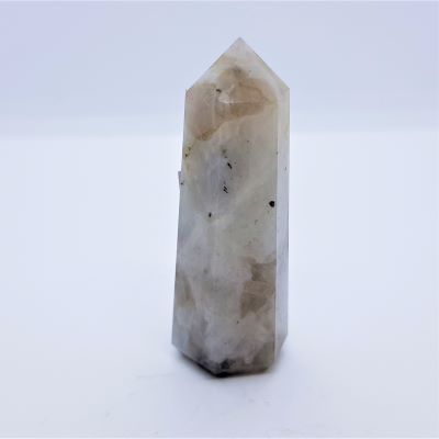 A pretty, small Rainbow Moonstone tower/point with black tourmaline at the base. No flash but still a nice piece.