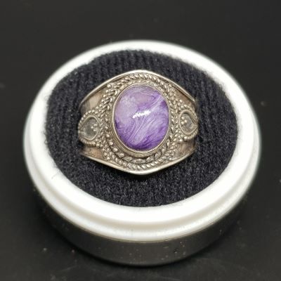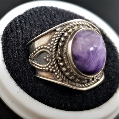 Very pretty silver ring with wide band narrowing to the rear and with detailed decoration. The ring is set with a lovely piece of Charoite.