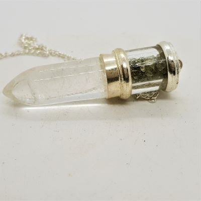 Moldavite and Quartz pendulum. Pendulum overall 50 mm long.  Clear quartz 'bullet' shape at the base with a compartment containing moldavite chips at the top. Dowsing pendulums are made in a wide range of materials and the shape and material will suggest the best uses for each piece.