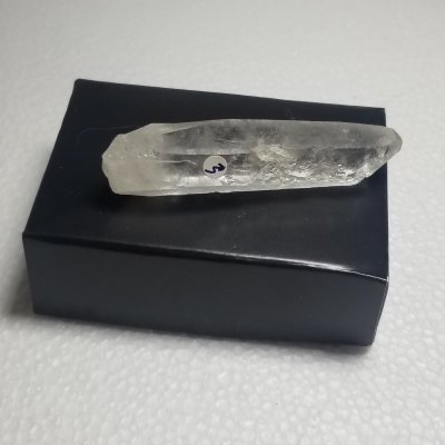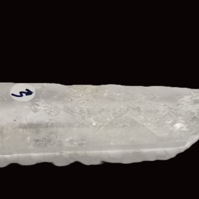 Nice Lightning Strike Quartz point. The area of the strike is indicated with a little label. This quartz comes from Serra de Espinaco Mountains of Brazil which is an area that has a high instance of thunder and lightning storms. These are so intense that it is believed that the strikes cause the quartz in the ground bears the marks.