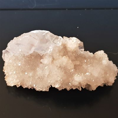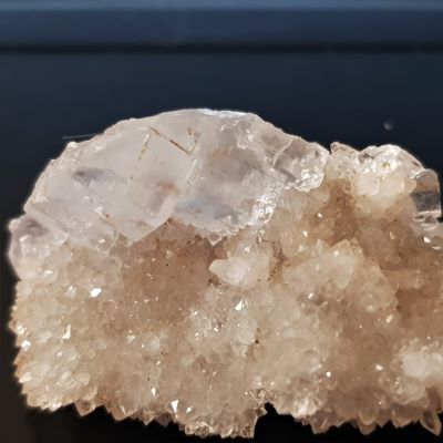 This is a gorgeous piece with clear Fluorite cubes and sparkling tiny quartz crystals on top and bottom. It is from Asturias, Spain.