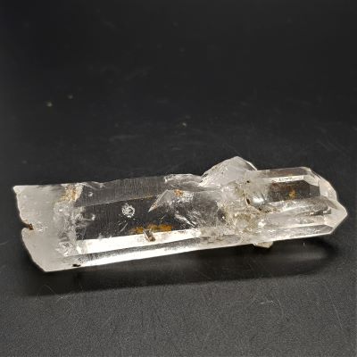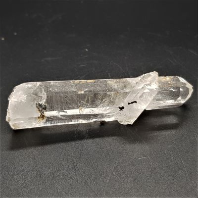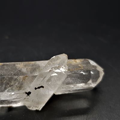 Lovely Gorama Quartz twin point with a bridge crystal and the remains of a needle penetrator crystal.