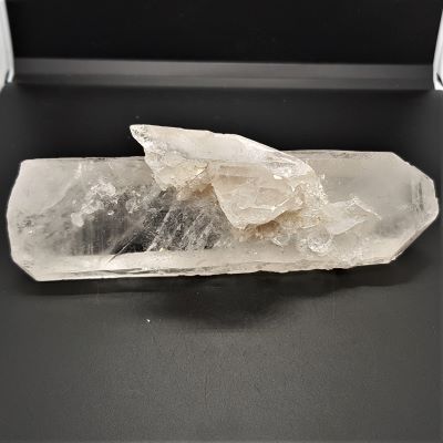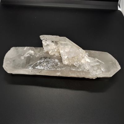 Large quartz point. There is a single diamond shaped crystal on top and a mass of smaller crystals. The tip is slightly castellated and there are striations and some etching on the main crystal too. A fabulous piece.