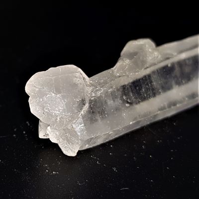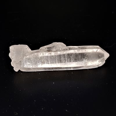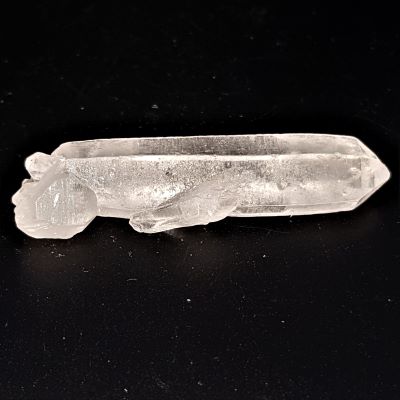 A funky double terminated quartz point with several more crystals growing on one point and dolphin formation (a small crystal on the side)
