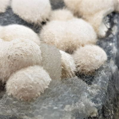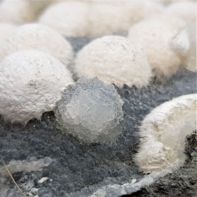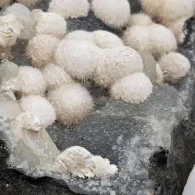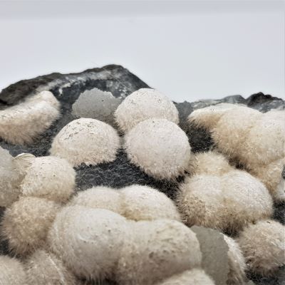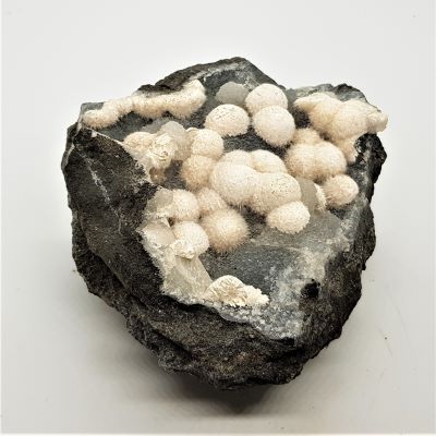 Mordenite or Okenite balls on Chalcedony. I am not sure which zeolite these are definitively hence using both descriptions for these similar minerals. Please note these are on matrix and are heavy.
