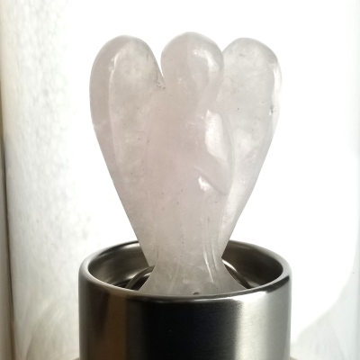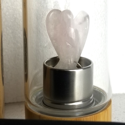 This water bottle is made from glass and bamboo with a neoprene cover and carrying loop. Inside is a beautiful Rose Quartz angel.