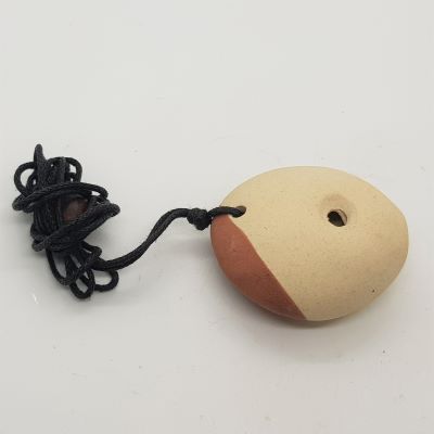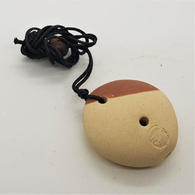 Mini Ocarino necklace. Ocarina are very ancient musical instruments known to have been made for thousands of years. They are made from clay, wood or stone with holes to enable them to be made, usually 4 or 6 holes. This mini version has a hole at the base, one on top and one underneath. Whilst it is not entirely capable of playing music it does sound notes a little more like a whistle but you might be more adept than I.