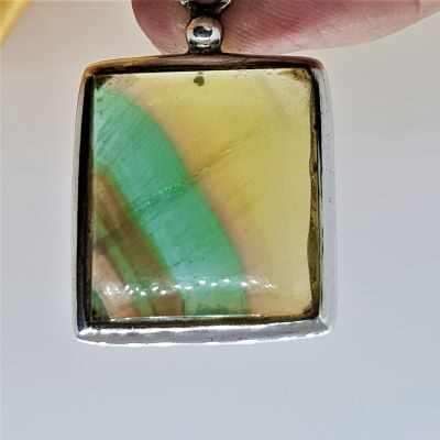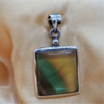 Stunning Fluorite in silver pendant. Yellow is a less common colour found in Fluorite in jewellery and this piece is also green and purple.