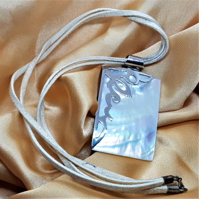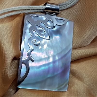 Gorgeous irridescent shell with silver decoration.  There is a double strand cord.