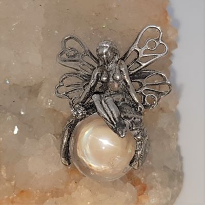 Silver Fairy sitting on Opal Aura Quartz Sphere Pendant