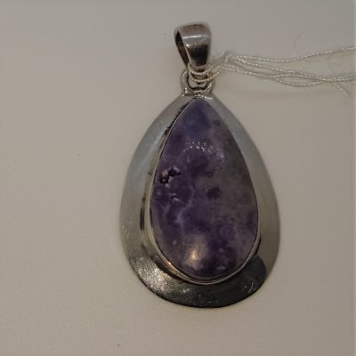 Tiffany Stone and silver pendant. A lovely wide silver setting around a teardrop shaped piece of Tiffany Stone.