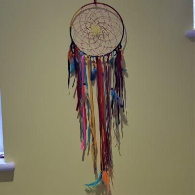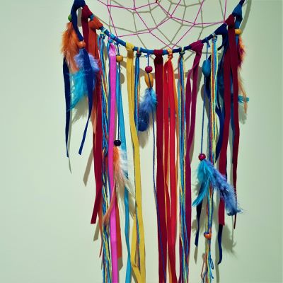 Unusual design of dreamcatcher in lovely bright colours of ribbons and feathers.