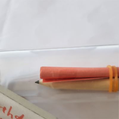 Glass tube with cork stopper and a tag attached with jute string.  Inside is a pencil and blank pink scroll for you to write your message.
