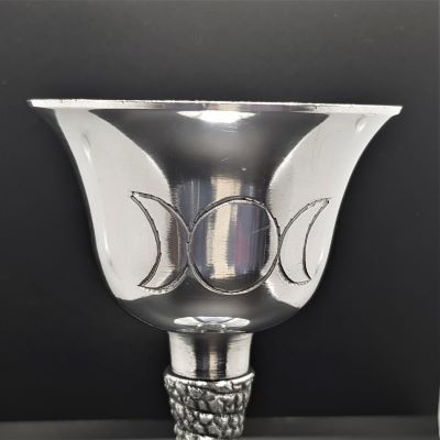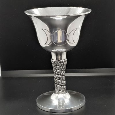 Silver coloured metal chalice with the triple moon symbol and pretty patterned stem. Lovely addition to your altar or your table.